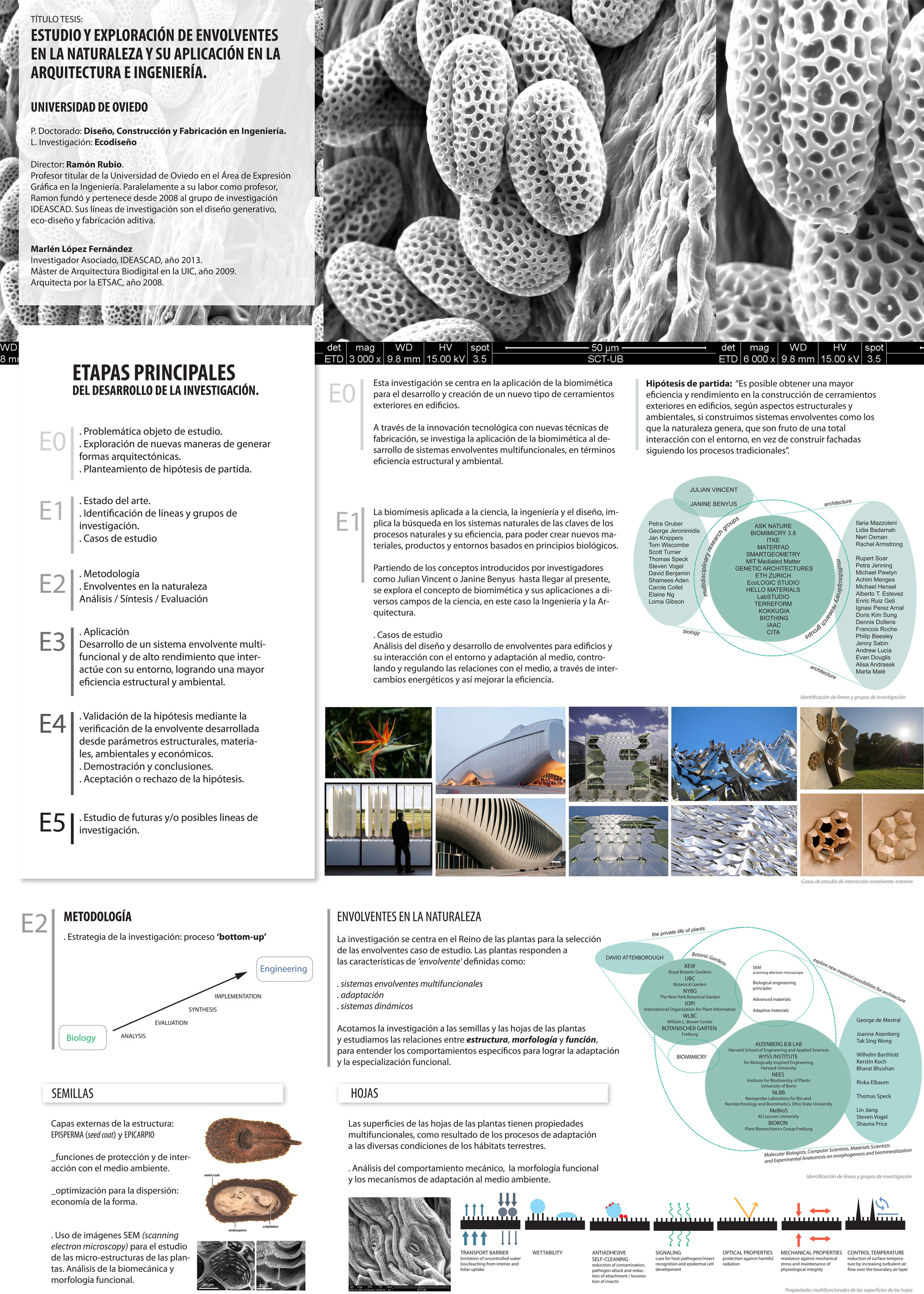 Mi investigación se centra en la aplicación de la biomimética para el desarrollo y creación de un nuevo tipo de cerramientos exteriores en edificios. A través de la innovación tecnológica con nuevas técnicas de fabricación, se investiga la aplicación de la biomimética al desarrollo de sistemas envolventes multifuncionales, en términos de eficiencia estructural y ambiental.