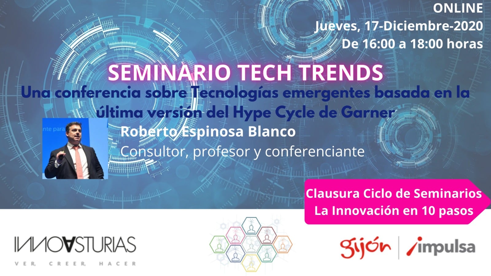 Y el mismo jueves 17, por la tarde, el broche de oro para el ciclo LA INNOVACIÓN EN 10 PASOS, con el Seminario «TECH TRENDS», impartido por Roberto Espinosa Blanco. Y de nuevo con Gijón Impulsa, claro.