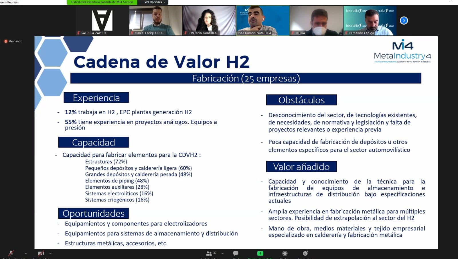 El miércoles 3 de marzo participamos en la primera reunión del grupo de trabajo «Desarrollo de la Cadena de Valor del Hidrógeno Verde” organizada por Metaindustry4 (Clúster de la Industria del Metal en Asturias).