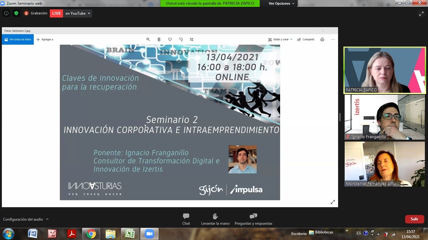 El martes 13 volvió a darnos suerte y pudimos participar también en el segundo seminario del ciclo CLAVES DE INNOVACIÓN PARA LA RECUPERACIÓN 2021, organizado por INNOVASTURIAS en colaboración con Gijón Impulsa, que tuvo por título «INNOVACIÓN CORPORATIVA E INTRAEMPRENDIMIENTO», con Ignacio Franganillo (IZERTIS).