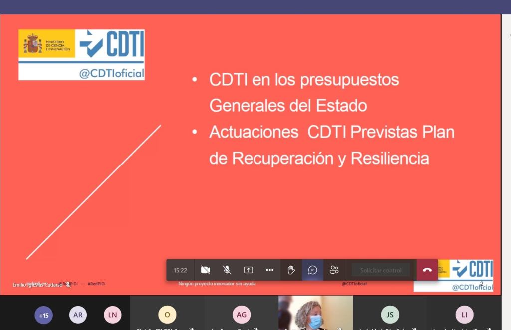 Y el mismo miércoles 14 completamos el día con el seminario online de la Red PIDI que, organizado por el Centro de Desarrollo Tecnológico y la Innovación (CDTI) / Ministerio de Ciencia e Innovación, se celebra en el Foro Transfiere de Málaga.