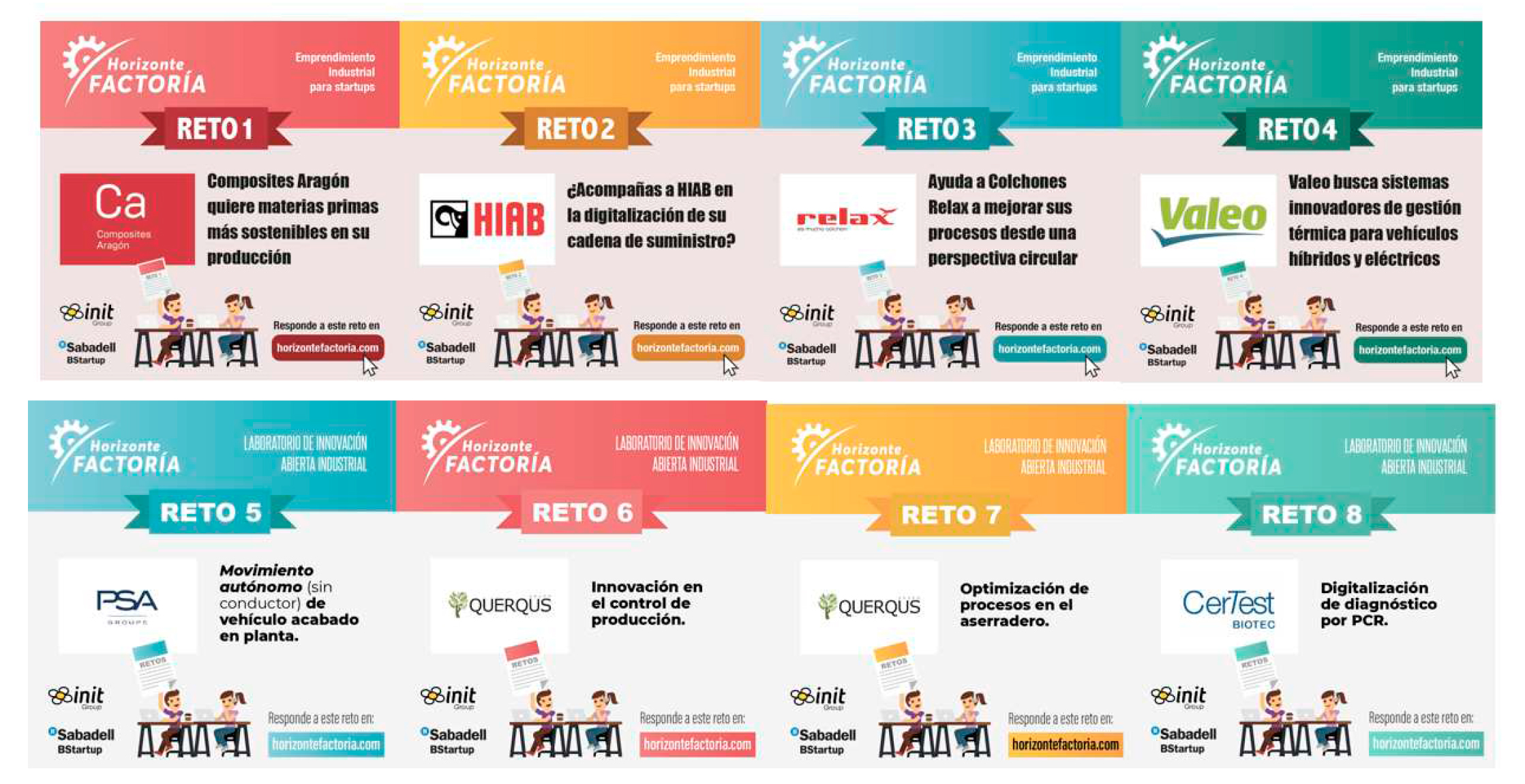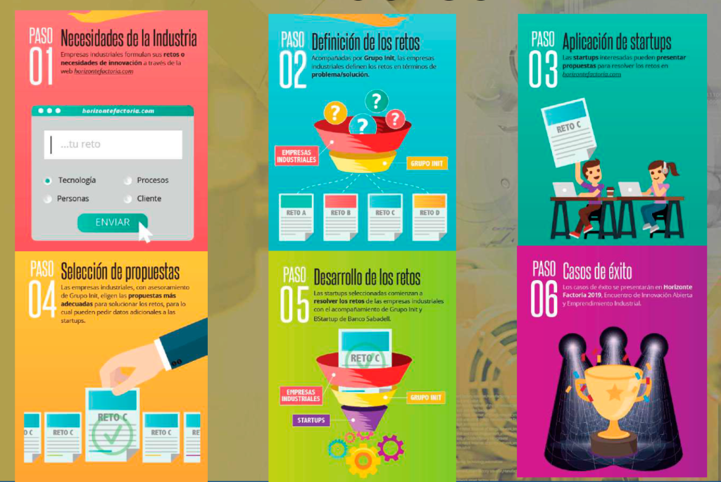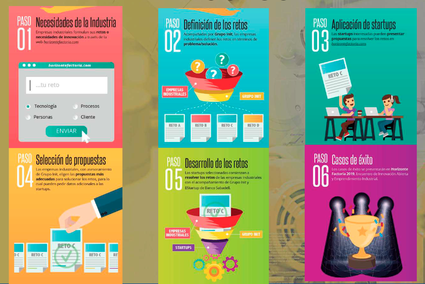 Horizonte Factoría concita la presencia de compañías/pymes industriales que posicionan un reto al que quieran dar respuesta. Para ello Grupo Init asegurará mediante metodología propia, aplicada con la industria, que el reto está definido en términos de problema y no de solución. Definido el reto y publicado en la web del Laboratorio, Grupo Init y BStartup de Banco Sabadell someten dichos retos al conjunto de emprendimientos y start ups tecnológicas e industriales de toda España. El objetivo es dar la mejor respuesta a ese reto desde el talento emprendedor español.