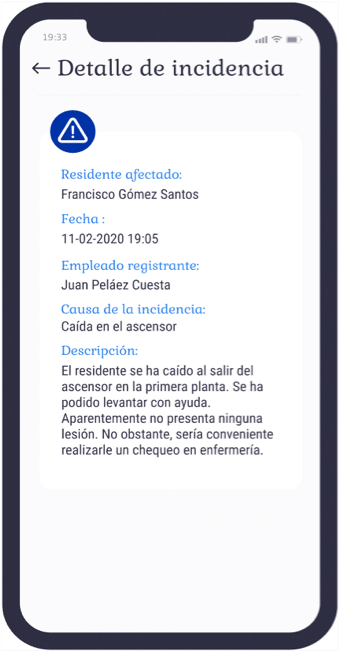 En la imagen siguiente podemos ver una captura de la pantalla del registro de una incidencia (en este caso, una caída). Asimismo, se registrarán todas las medidas que se hayan tomado para el tratamiento de la incidencia –que en este caso podría ser la llamada a una ambulancia o una primera cura– o si el incidente se ha saldado sin mayores consecuencias para el paciente.