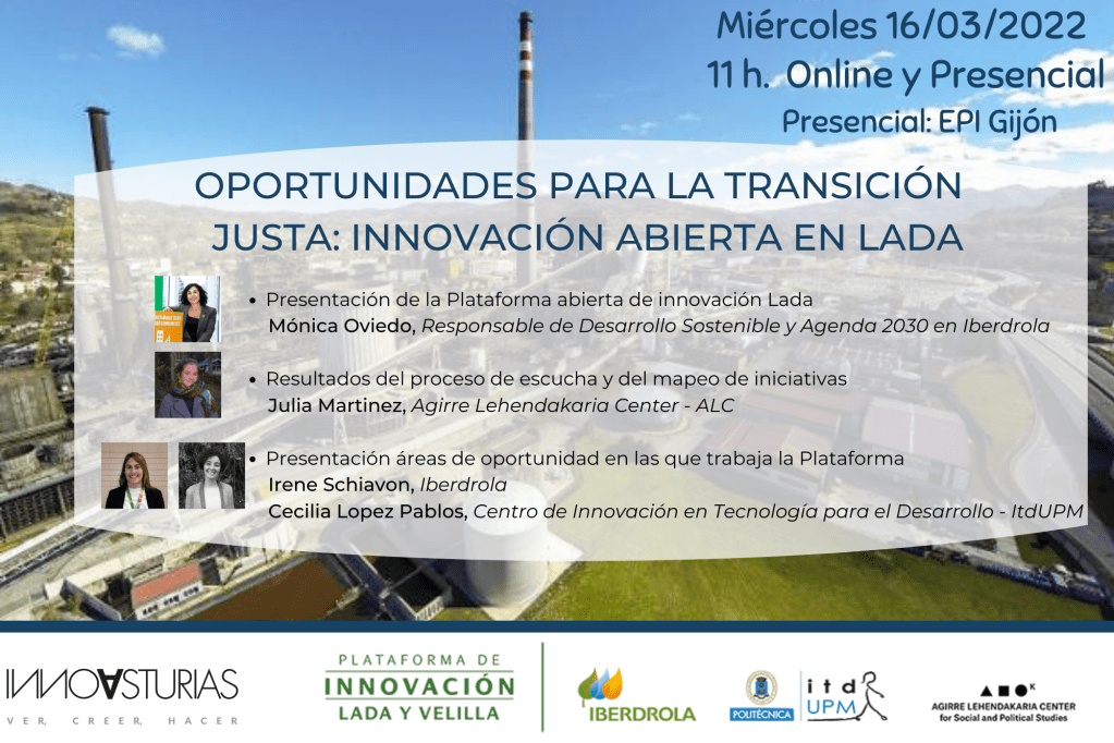 En colaboración con la PLATAFORMA DE INNOVACIÓN LADA Y VELILLA, hemos organizado la Jornada online «OPORTUNIDADES PARA LA TRANSICIÓN JUSTA: INNOVACIÓN ABIERTA EN LADA».