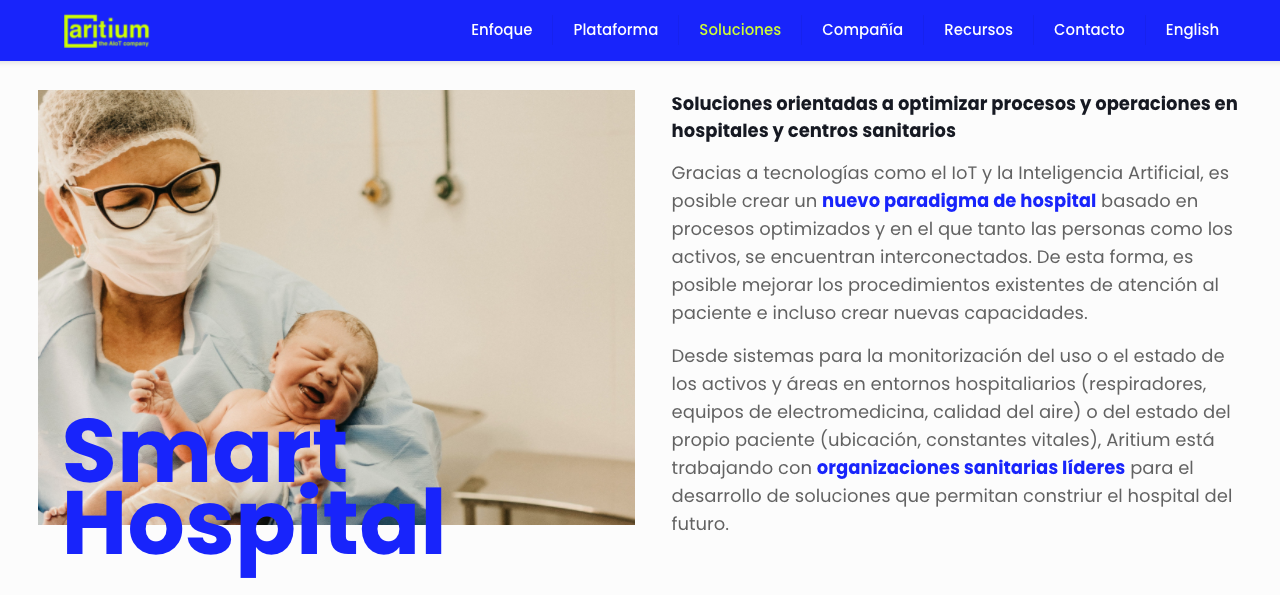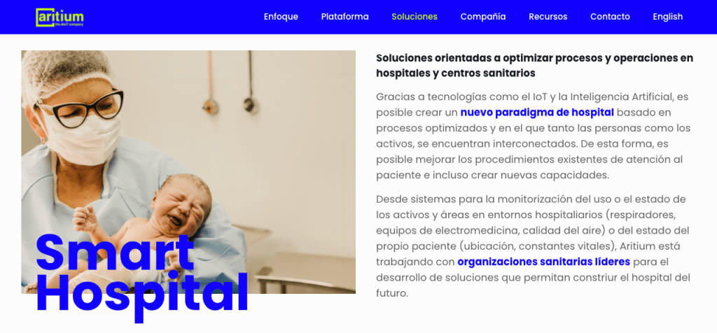 Somos una startup que combina el IoT y la Inteligencia Artificial para desarrollar soluciones que permitan optimizar diversos procesos en el ámbito hospitalario. En un hospital tipo, los profesionales de enfermería dedican menos de un 33% de su tiempo a tareas relacionadas con la atención directa al paciente. Existen multitud de tareas administrativas, de documentación y de bajo valor añadido que consumen más de dos tercios de su tiempo. Desde Aritium creemos que es posible cambiar esto y por tanto ponemos nuestra tecnología a disposición de los hospitales y las organizaciones sanitarias con el objetivo de permitir que los profesionales sanitarios puedan dedicar su tiempo a aquello que hacen mejor: cuidar de los pacientes. Desde sistemas que monitoricen de forma automática la temperatura de almacenamiento de las medicinas hasta soluciones que monitorizan de forma transparente las constantes vitales de los pacientes mediante el uso de wearables, nuestro objetivo, aunque suene paradójico, es utilizar la tecnología para humanizar la atención sanitaria.