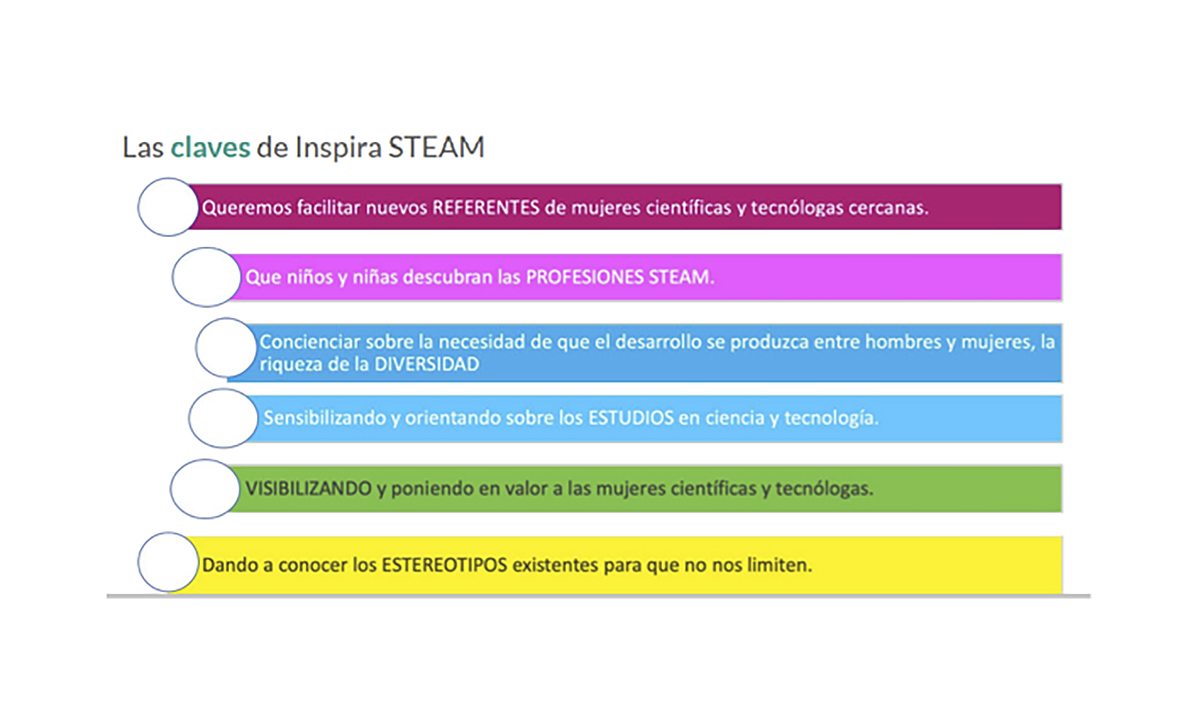 Inspira STEAM es un proyecto pionero para el fomento de la vocación científico-tecnológica entre las niñas y los niños, basado en acciones de sensibilización y orientación, que imparten mujeres profesionales del mundo de la investigación, la ciencia y la tecnología.