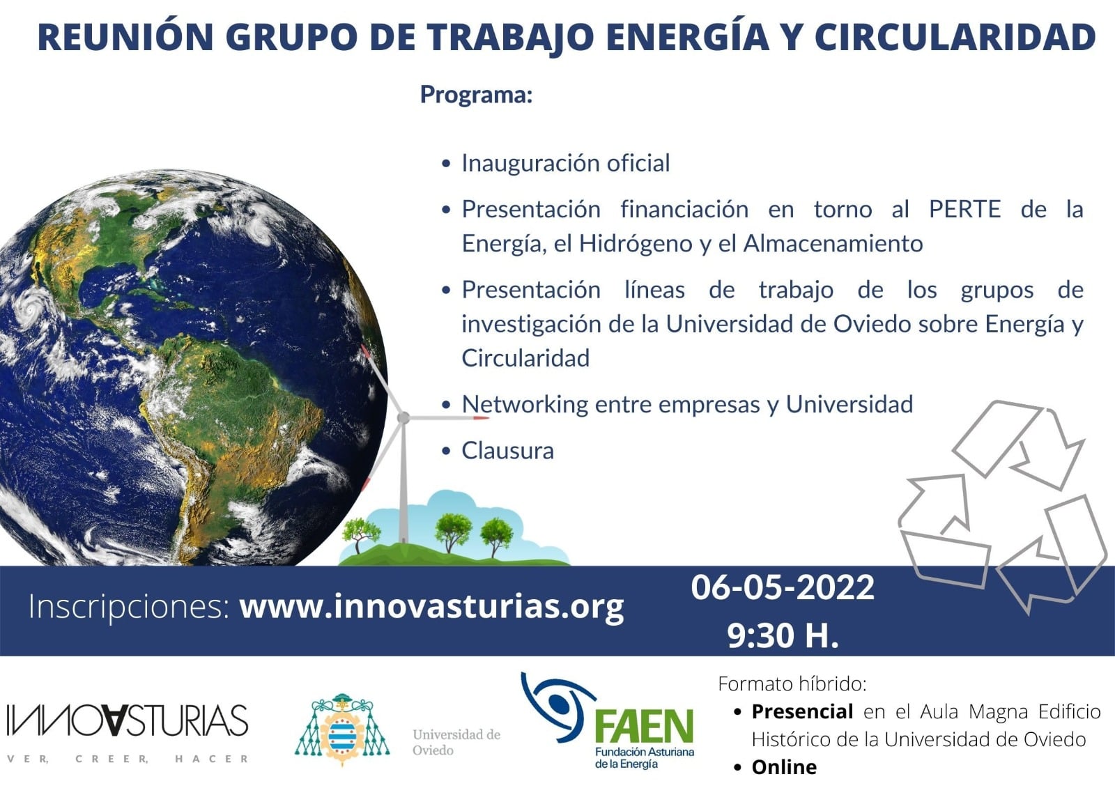 En este ámbito, hoy viernes, 6 de mayo, hemos celebrado la reunión de trabajo sobre «ENERGÍA Y CIRCULARIDAD» que organizamos conjuntamente la Universidad de Oviedo e Innovasturias, para encontrar sinergias entre empresas y grupos de investigación.