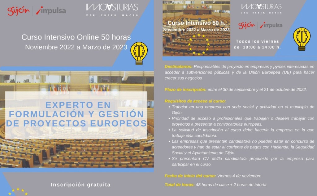 Hasta el viernes 21 de octubre ya te puedes inscribir en el curso «EXPERTO EN FORMULACIÓN Y GESTIÓN DE PROYECTOS EUROPEOS», que Innovasturias pone en marcha con la financiación de Gijón Impulsa.
