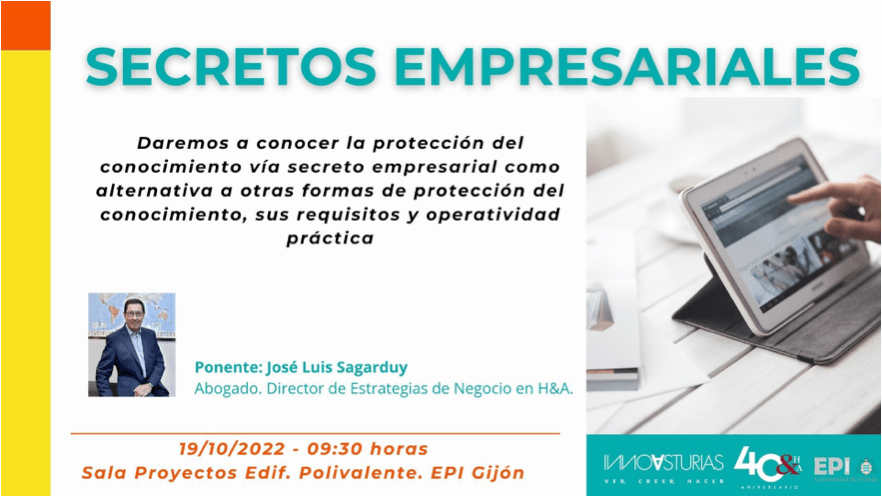 Por último –de momento–, el próximo miércoles 19 de octubre celebraremos en la Sala de Proyectos de la Escuela Politécnica de Ingeniería (EPI • Universidad de Oviedo) de Gijón la Jornada «SECRETOS EMPRESARIALES», impartida por José Luis Sagarduy, abogado y Director de Estrategias de Negocio en H&A.