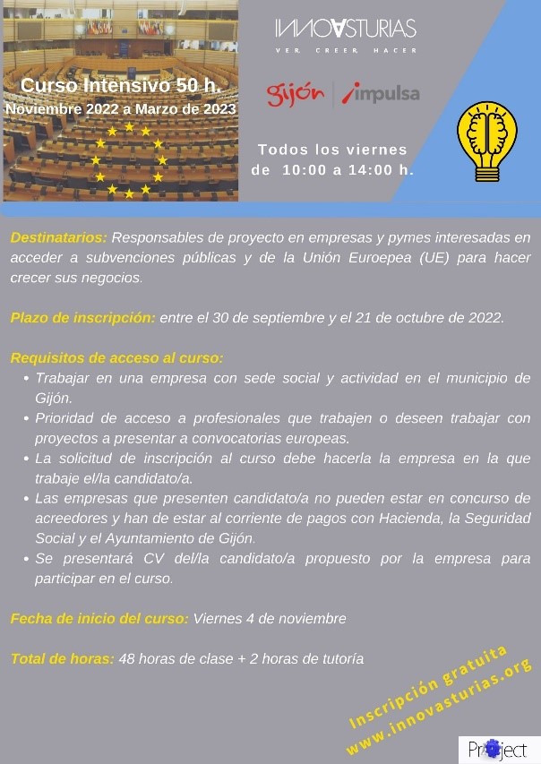 El próximo viernes 4 de noviembre comenzaremos el curso EXPERTO EN FORMULACIÓN Y GESTIÓN DE PROYECTOS EUROPEOS, que Innovasturias pone en marcha con la financiación de Gijón Impulsa.