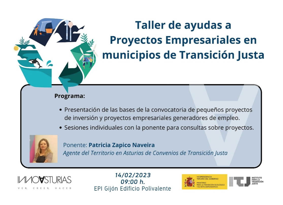 El martes 14 de febrero Innovasturias organizará el Taller «AYUDAS A PROYECTOS EMPRESARIALES EN MUNICIPIOS DE TRANSICIÓN JUSTA», a las 9:00 horas en la Escuela Politécnica de Ingeniería de Gijón.