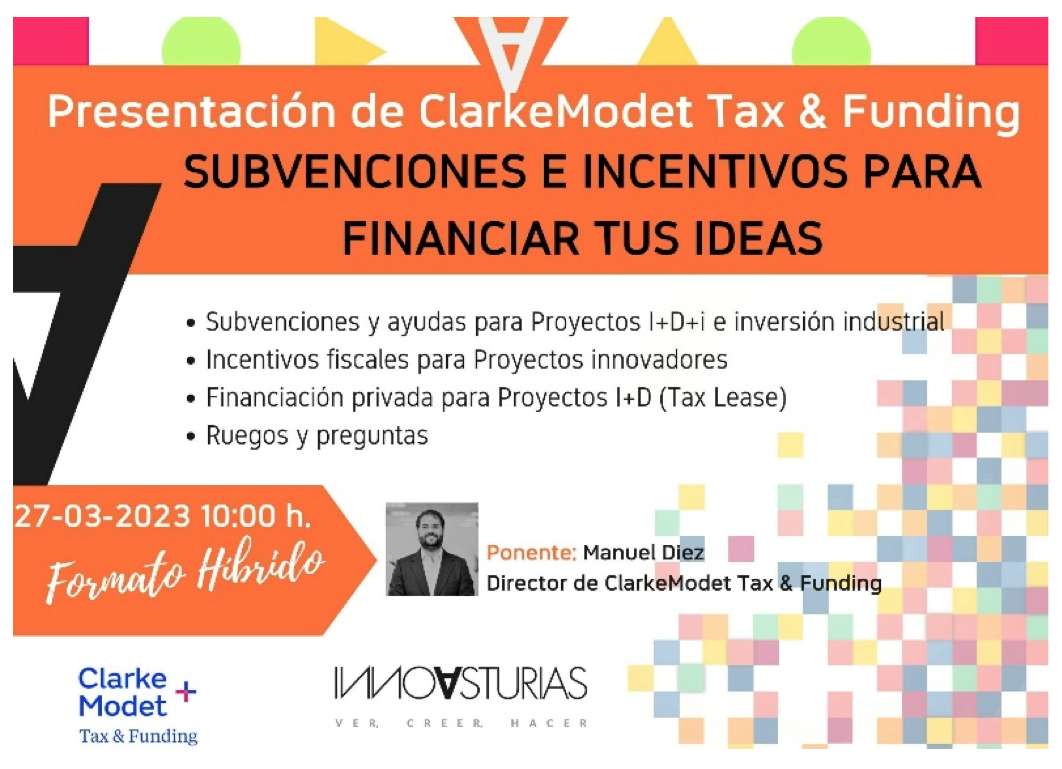Por último –de momento–, el lunes 27 de marzo, a las 10:00 horas, en formato híbrido (online y presencial), celebraremos la jornada PRESENTACIÓN DE «CLARKE+MODET TAX & FUNDING • Subvenciones e incentivos para financiar tus ideas”, de la mano de Manuel Diez, Director de Clarke+Modet Tax & Funding.