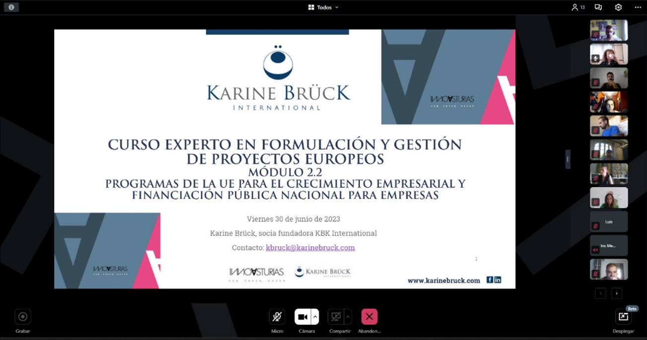 Innovasturias celebró hoy viernes la tercera jornada semanal del Curso “EXPERTO EN FORMULACIÓN Y GESTIÓN DE PROYECTOS EUROPEOS 2023” para empresas con sede en Asturias, que estuvo liderada, una vez más, por Karine Brück (KBK International).