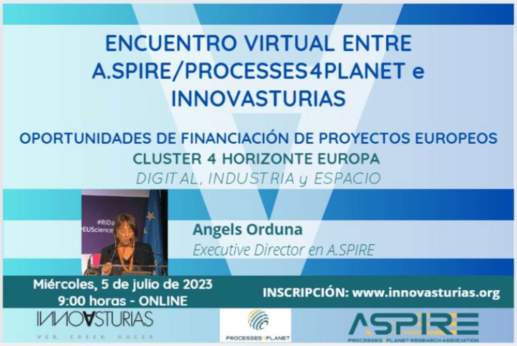 El próximo miércoles, 5 de julio, en formato online y exclusivamente para socios de Innovasturias, se celebrará el ENCUENTRO VIRTUAL ENTRE A.SPIRE/PROCESSES4PLANET e INNOVASTURIAS, en el que se mostrarán las oportunidades de financiación de proyectos europeos para el Clúster 4 Horizonte Europa (Digital, Industria y Espacio).