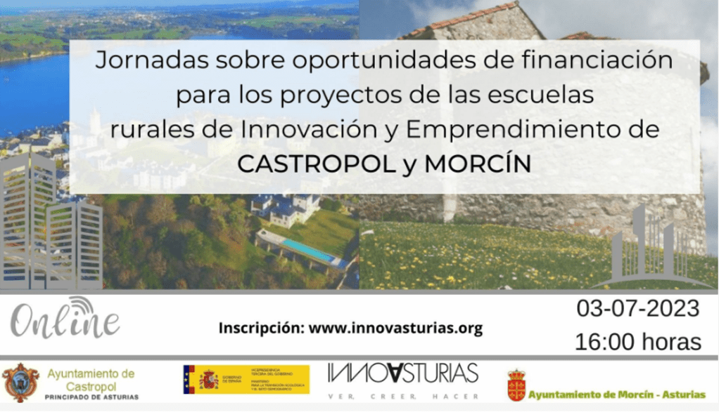 También el lunes 3 de julio, celebraremos –a las 16:00 horas y en formato online– una jornada sobre OPORTUNIDADES DE FINANCIACIÓN PARA PROYECTOS DE LAS ESCUELAS RURALES DE INNOVACIÓN DE CASTROPOL Y MORCÍN.