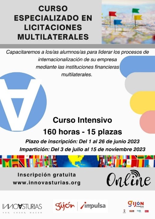 Innovasturias continua con el curso de ESPECIALIZACIÓN EN LICITACIONES MULTILATERALES que está financiado por Gijón Impulsa, en la Convocatoria de Incentivos 2023 para empresas de Gijón y que finalizará el próximo miércoles 15 de noviembre de 2023.