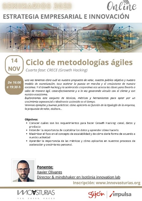 El próximo 14 de noviembre Innovasturias organizará de forma online a las 16:00 h. el último Seminario del Ciclo Estrategia Empresarial e Innovación, financiado por Gijón Impulsa bajo el título CICLO METODOLOGÍAS ÁGILES: CRECE (GROWTH HACKING).