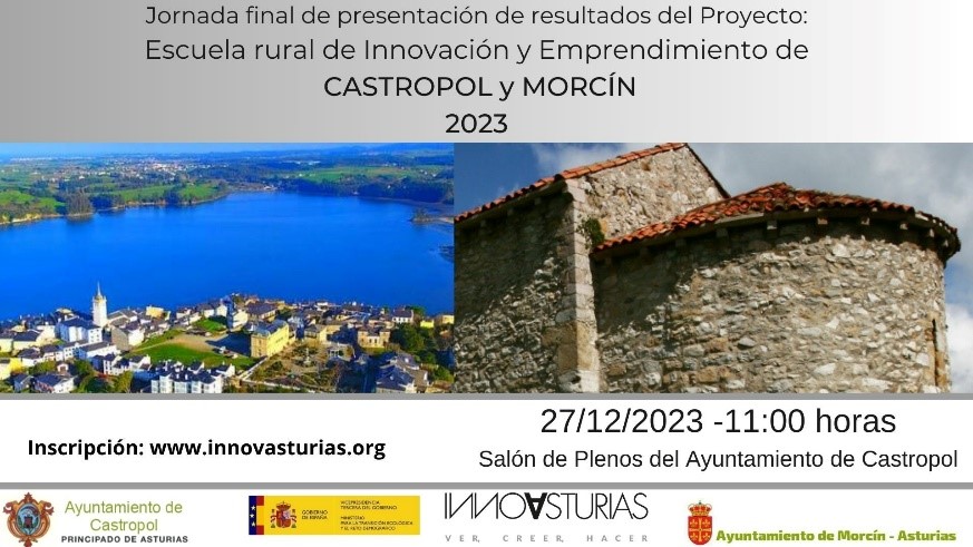 El próximo 27 de diciembre a las 11:00 horas en el Salón de Plenos del Ayuntamiento de Castropol, Innovasturias celebrará la Jornada final de presentación de resultados del proyecto: Escuela Rural de Innovación y Emprendimiento de Castropol y Morcin 2023.
