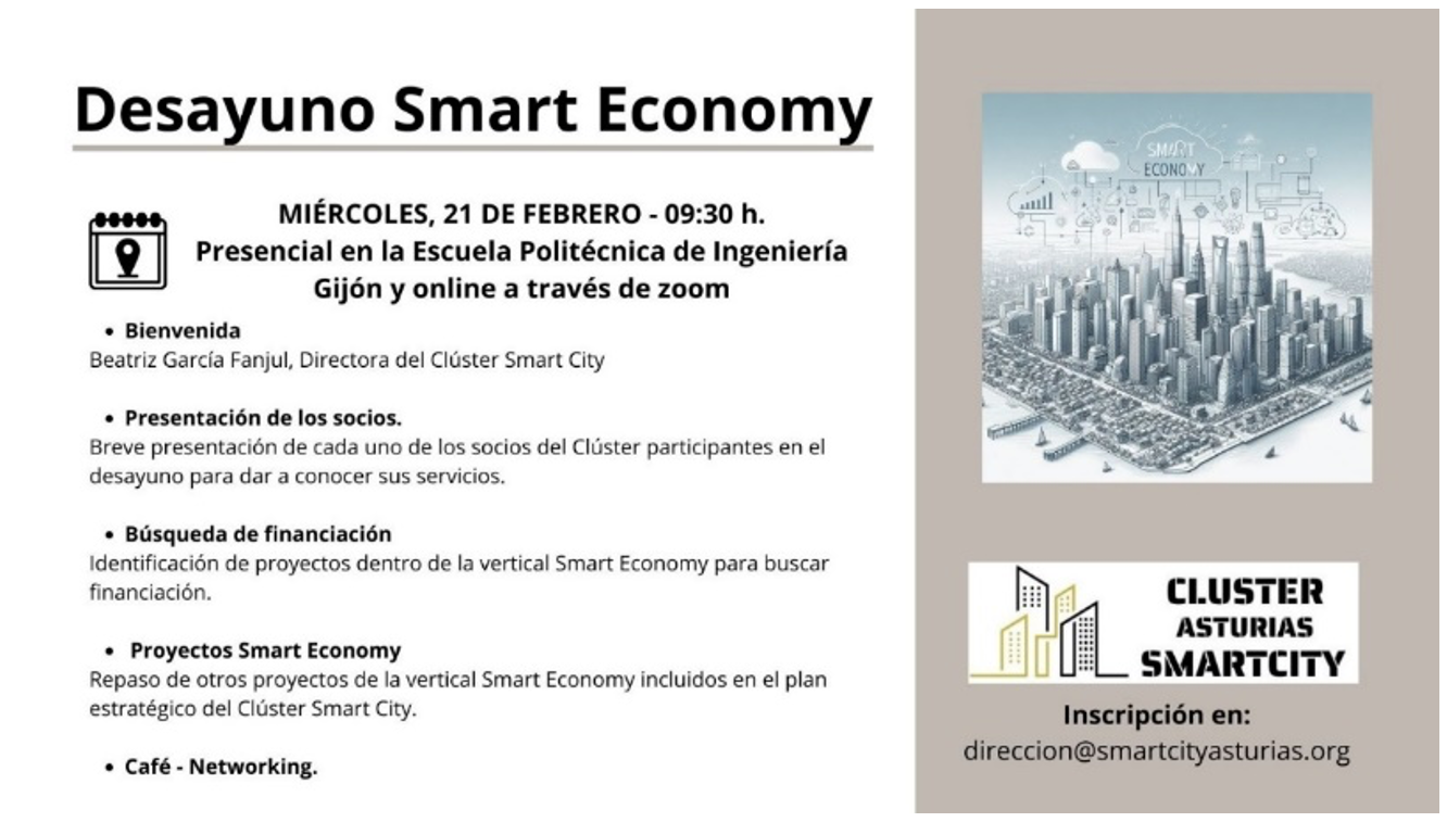 El próximo miércoles, 21 de febrero, el Clúster Smart City celebrará el Desayuno «SMART ECONOMY».