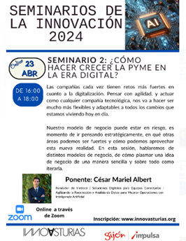 Este martes 23 de abril de 16 a 18:00 horas, celebramos de forma online el segundo Seminario del Ciclo SEMINARIOS DE LA INNOVACIÓN 2024. ¿CÓMO HACER CRECER LA PYME EN LA ERA DIGITAL?, financiado por Gijón Impulsa.