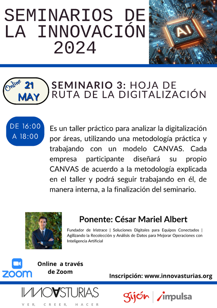 El 21 de mayo de 16:00 a 18:00 horas, celebraremos de forma online el tercer Seminario del Ciclo SEMINARIOS DE LA INNOVACIÓN 2024. HOJA DE RUTA DE DIGITALIZACIÓN financiado por Gijón Impulsa.