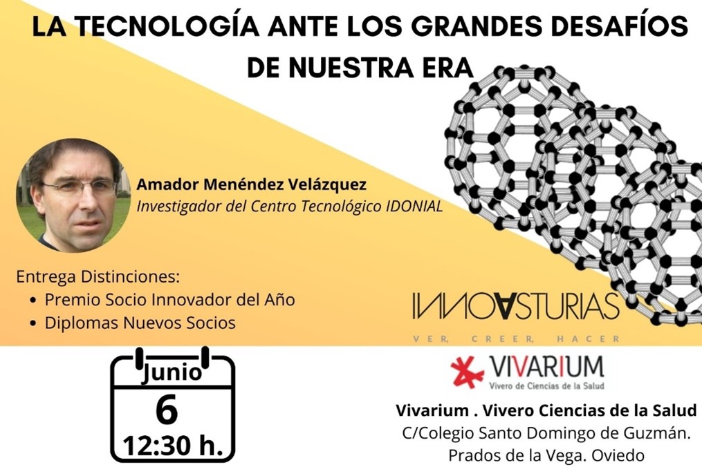 El 6 de junio a las 11:30 horas, INNOVASTURIAS celebrará su Asamblea General (solo socios), posteriormente a las 12:30 h, en el Vivarium – Vivero Ciencias de la Salud, celebraremos un Acto Público abierto a todo el mundo en el que haremos entrega de Diplomas a los nuevos Socios, Premio al Socio Innovador y por último contaremos con la presencia de Amador Menéndez Velázquez, Investigador del Centro Tecnológico de IDONIAL, quien nos ofrecerá la Conferencia “LA TECNOLOGÍA ANTE LOS GRANDES DESAFÍOS DE NUESTRA ERA”.