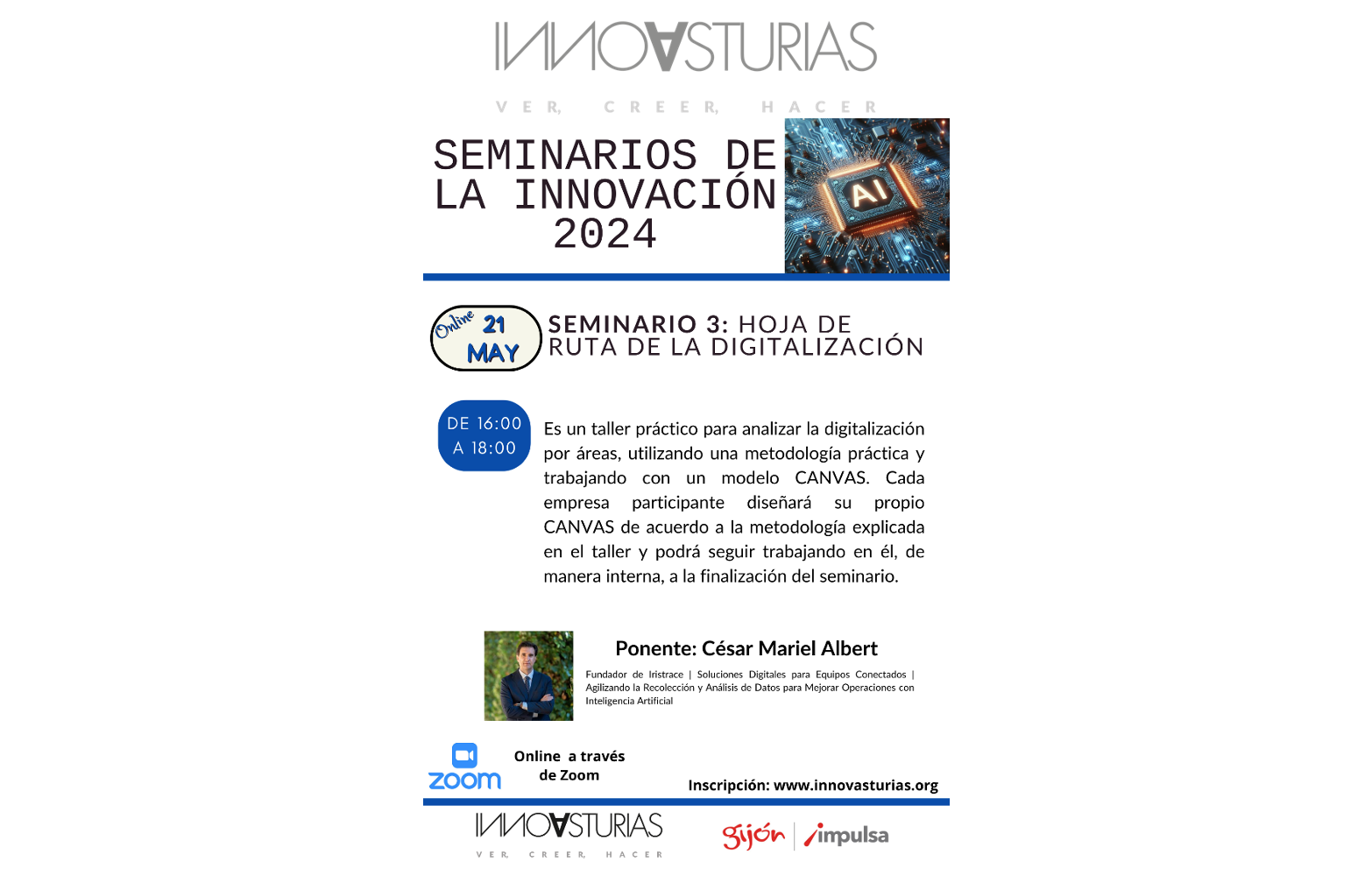 El 21 de mayo celebraremos el tercer seminario del ciclo SEMINARIOS DE INNOVACIÓN 2024, financiado por Gijón Impulsa, bajo el título «¿HOJA DE RUTA DE DIGITALIZACIÓN».