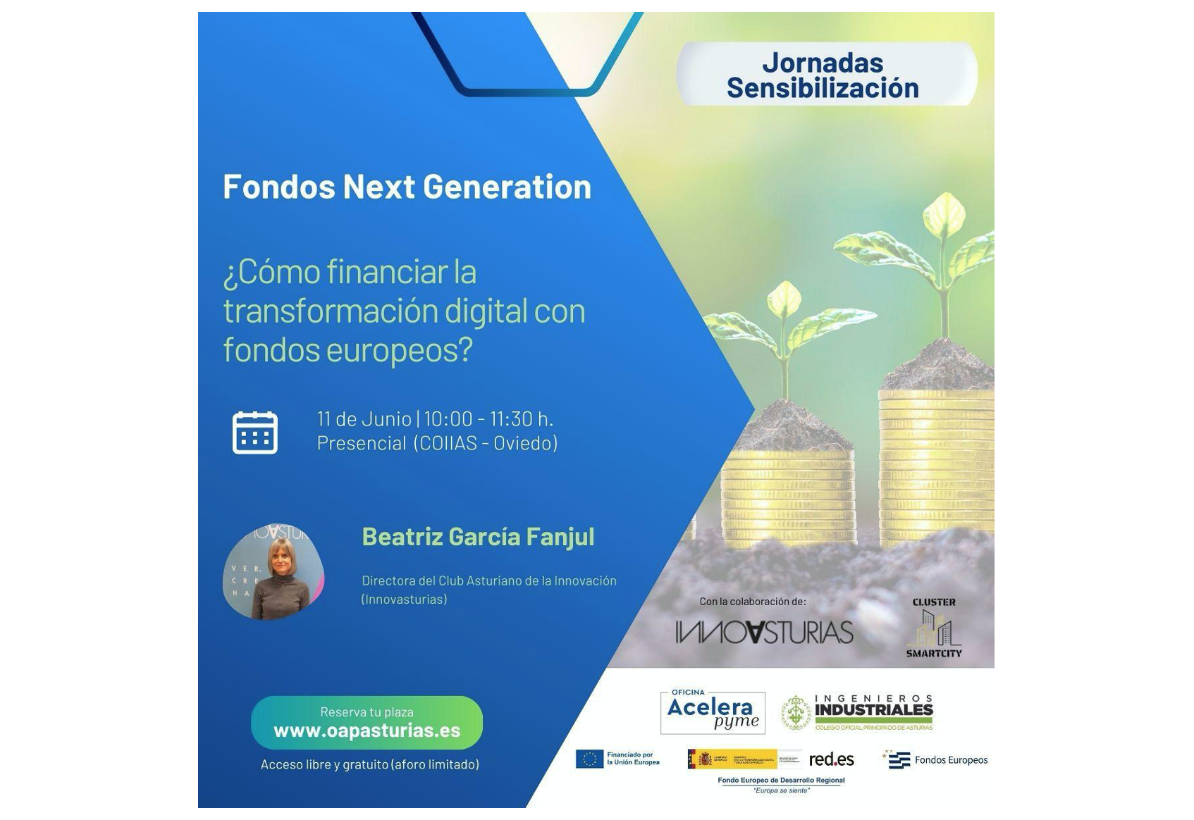 El próximo martes 11 de junio, de 10:00 a 11:30 horas, Beatriz García Fanjul, Directora de Innovasturias, impartirá, en el marco de dos jornadas sobre Fondos Next Generation, la charla «¿CÓMO FINANCIAR LA TRANSFORMACIÓN DIGITAL CON FONDOS EUROPEOS?», organizada por el Colegio Oficial de Ingenieros Industriales del Principado de Asturias (COIIAS).