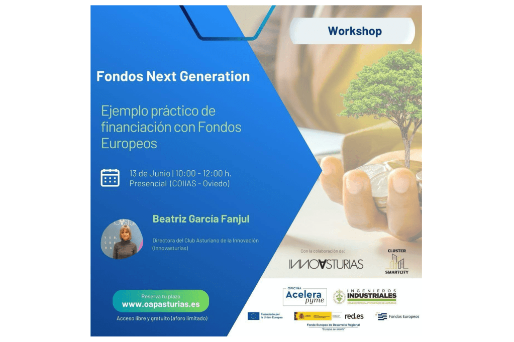 Dos días después, el jueves 13 de junio, de 10:00 a 12:00 horas, Beatriz García Fanjul, Directora de Innovasturias, impartirá, en el mismo marco de dos jornadas sobre sobre Fondos Next Generation, el workshop presencial «EJEMPLO PRÁCTICO DE FINANCIACIÓN CON FONDOS EUROPEOS», organizado igualmente por el Colegio Oficial de Ingenieros Industriales del Principado de Asturias (COIIAS).