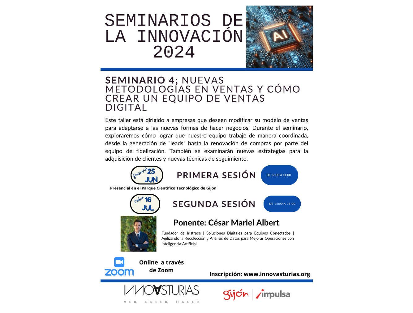 El 25 de junio celebraremos el cuarto seminario del ciclo SEMINARIOS DE INNOVACIÓN 2024, financiado por Gijón Impulsa, bajo el título «NUEVAS METODOLOGÍAS EN VENTAS Y CÓMO CREAR UN EQUIPO DE VENTAS DIGITAL».