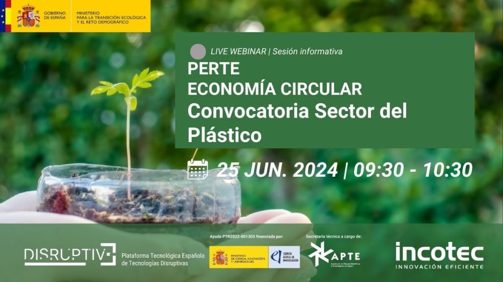 El próximo martes 25 de junio, a las 9:30 horas (en formato online) nuestro socio INCOTEC, junto con la Plataforma Tecnológica Española de Tecnologías Disruptivas PT DISRUPTIVE (impulsada por la Asociación de Parques Científicos y Tecnológicos de España [APTE]), organiza el webinar «CONVOCATORIA SECTOR DEL PLÁSTICO • PERTE ECONOMÍA CIRCULAR».