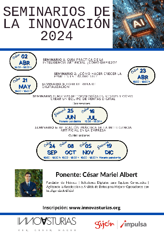 Hemos organizado un nuevo Ciclo de Seminarios de Innovación 2024 en colaboración con Gijón Impulsa, compuesto por 5 Seminarios con 9 sesiones formativas en total. Este ciclo se imparte con algunas sesiones en presencial y otras en formato online. El ponente de todas ella es Cesar Mariel, Fundador de Iristrace. El 24 de septiembre llegamos al ecuador de las jornadas, después del parón de agosto para recobrar fuerzas.