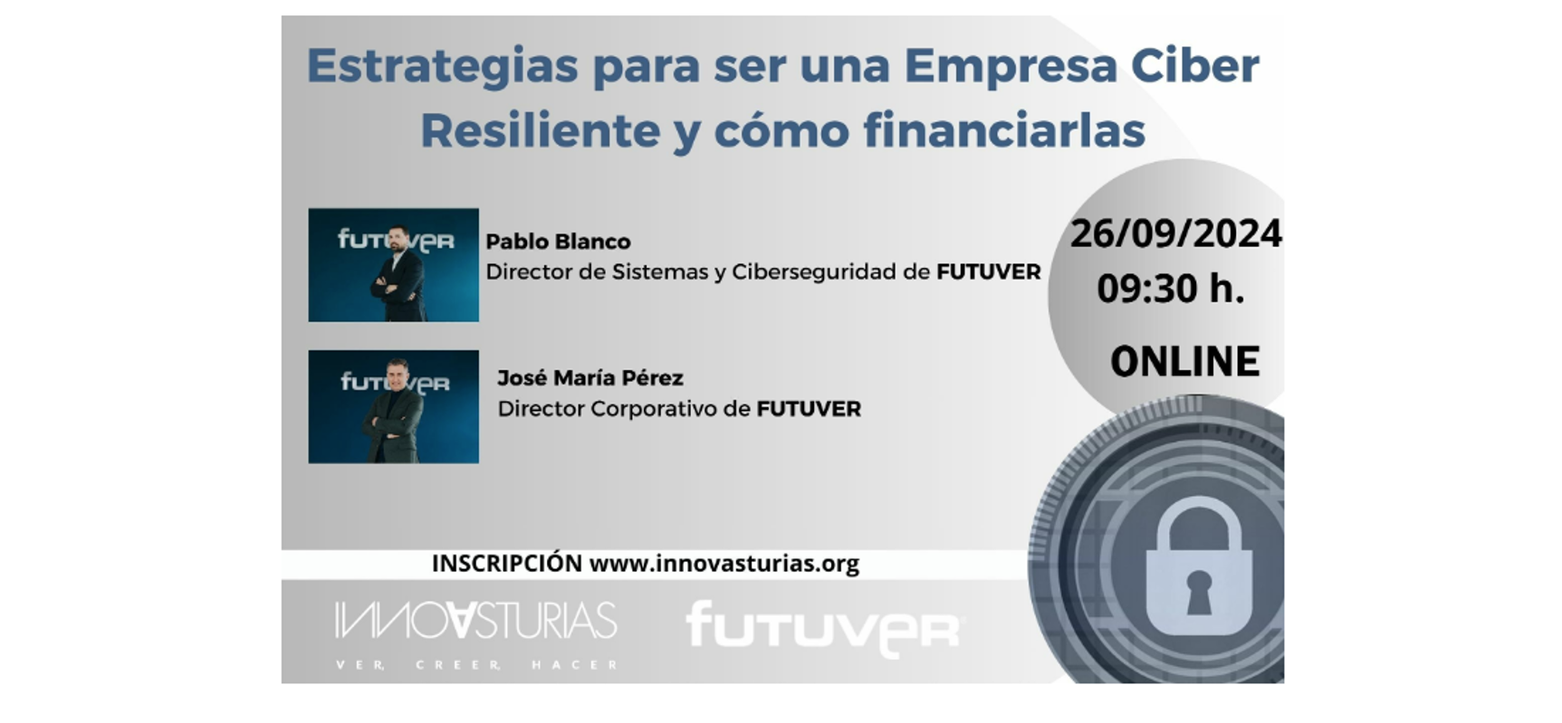 En colaboración con FUTUVER, Innovasturias organiza el próximo jueves, 26 de septiembre, a partir de las 09:30 y en formato online, la jornada «ESTRATEGIAS PARA SER UNA EMPRESA CIBER RESILIENTE Y CÓMO FINANCIARLAS».
