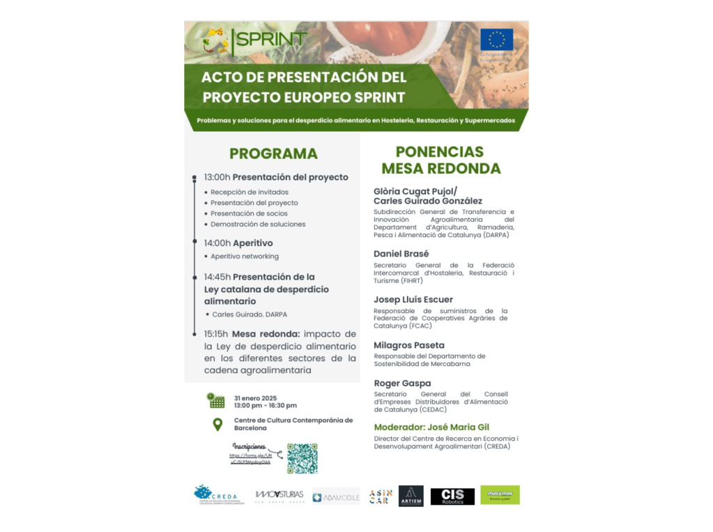 Hoy mismo, viernes 31 de octubre, el proyecto europeo «SPRINT-Zero Food Waste», coordinado por Innovasturias y respaldado por un consorcio diverso que incluye al Centro de Investigación en Economía y Desarrollo Agroalimentario (CREDA), el clúster agroalimentario ASINCAR, ABAMOBILE, CIS_ROBOTICS, Supermercados MASYMAS y ARTIEM Hotels, celebra una nueva jornada en el Centro de Cultura Contemporánea de Barcelona para conocer los problemas y soluciones para el desperdicio alimentario en Hostelería, Restauración y Supermercados.