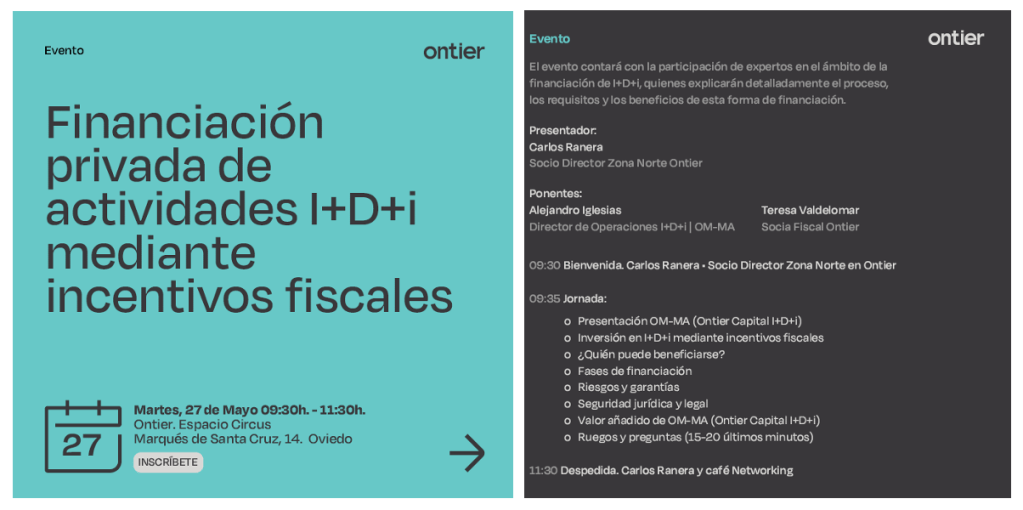 La entidad OM-MA, socia de Innovasturias, celebrará el próximo martes 27 de mayo en el Espacio Circus de Ontier Oviedo la jornada sobre «FINANCIACIÓN PRIVADA DE ACTIVIDADES I+D+I MEDIANTE INCENTIVOS FISCALES».